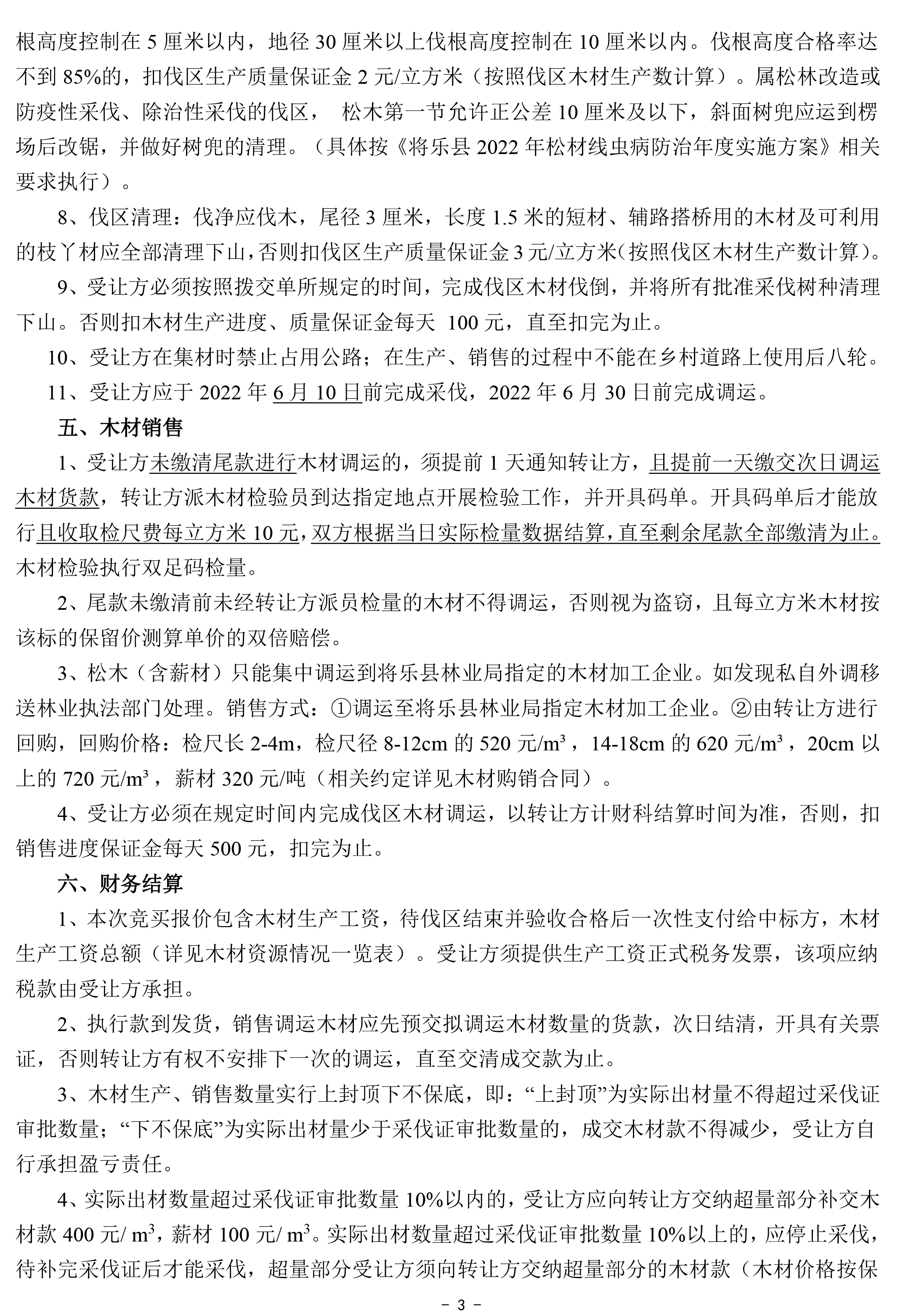 重要信息披露 | 1、標的簡介所列的出材量等數(shù)據(jù)僅供參考,標的以現(xiàn)狀交付,轉(zhuǎn)讓方及交易中心不承擔標的面積與實測面積、標的出材量與實際出材量差異等責任,不調(diào)整相應的成交價格。 2、本次競買報價包含木材生產(chǎn)工資,木材生產(chǎn)工資總額詳見木材資源情況一覽表,待伐區(qū)結(jié)束并驗收后一次性支付給受讓方。 3、銷售費用、成交后發(fā)生的政策變化費用、稅收均由受讓方承擔。 4、松木(含薪材)只能集中調(diào)運到將樂縣林業(yè)局指定的木材加工企業(yè)。如發(fā)現(xiàn)私自外調(diào)的,將移送林業(yè)執(zhí)法部門處理。銷售方式:①調(diào)運至將樂縣林業(yè)局指定木材加工企業(yè)。②由轉(zhuǎn)讓方指定單位進行收購(相關約定詳見木材購銷合同)。 5、受讓方應于2022年6月10日前完成采伐,2022年6月30日前完成調(diào)運。 6、未盡事宜詳見木材資源情況一覽表、競買約定、木材生產(chǎn)承包合同(范本)、木材購銷合同(范本)、伐區(qū)位置示意圖等本公告其他附件。 | ||