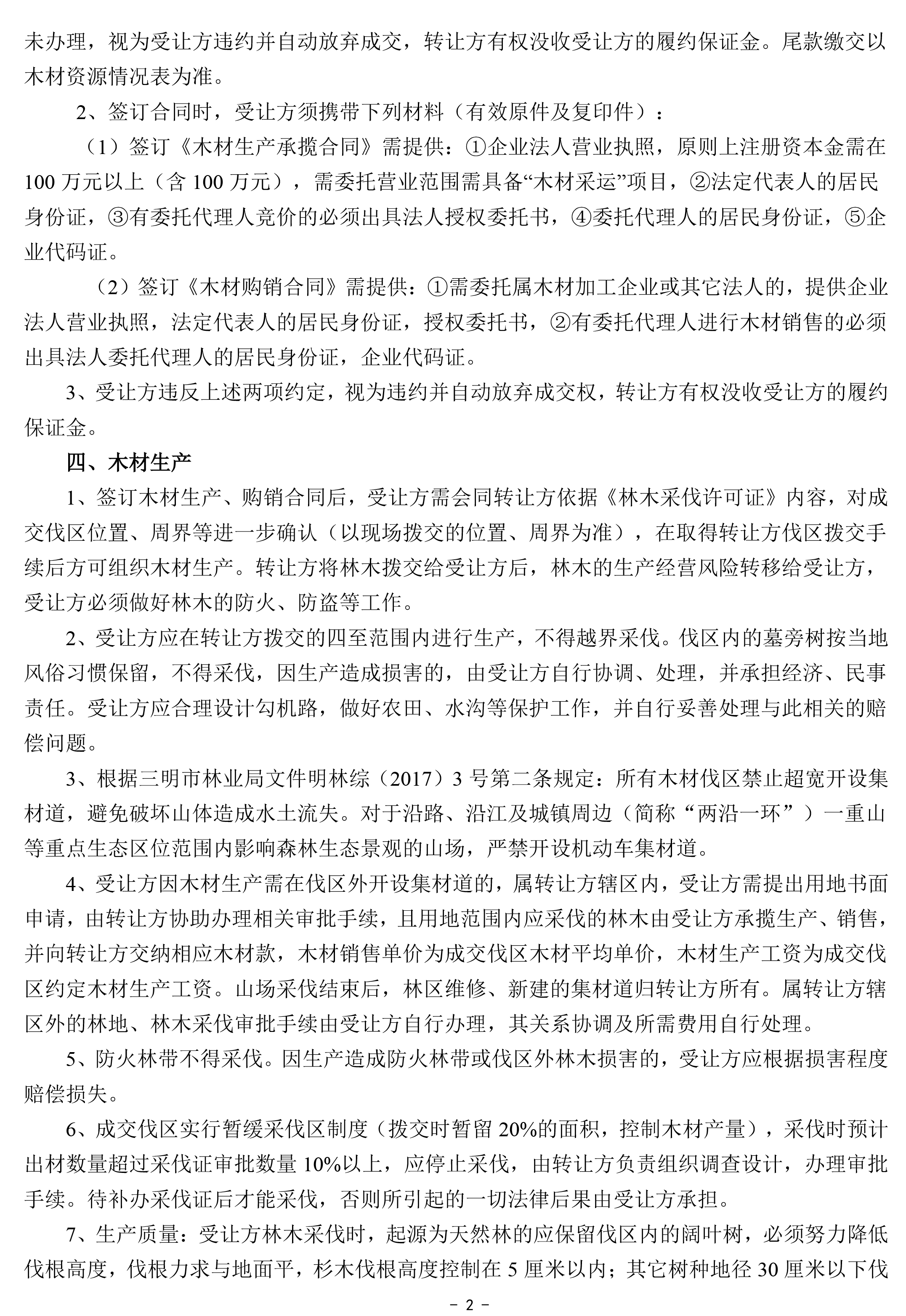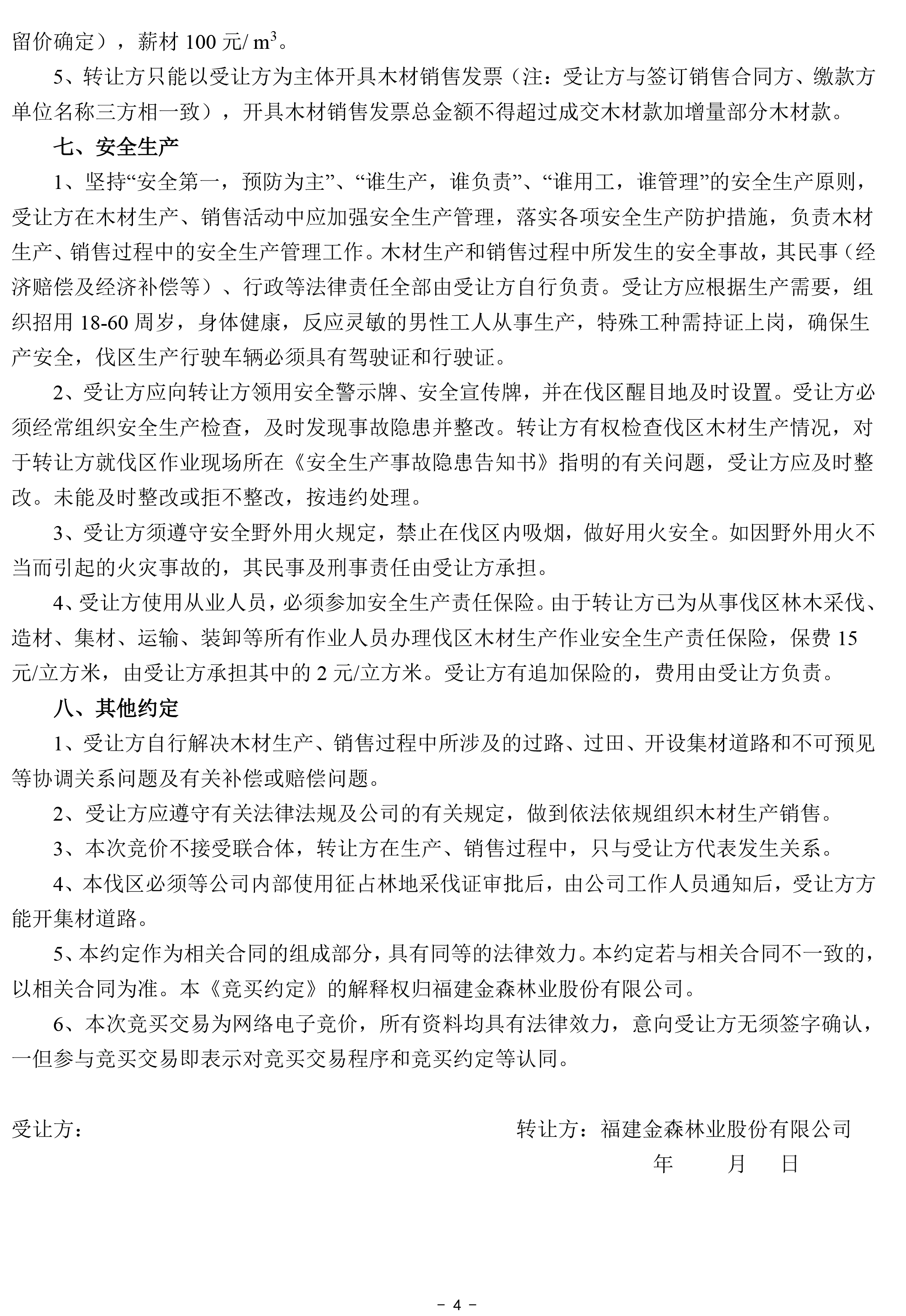 成交確認、價款支付及合同簽訂 | 1 .成交后的兩個工作日內(nèi)受讓方以微信、郵箱等方式收到《成交通知書》掃描件或電話通知;若受讓方未及時收到成交通知書的,請主動與轉(zhuǎn)讓方聯(lián)系。 2.價款交納日期及方式:成交后,受讓方須于2022年4月5日17:00前將首期木材款(詳見木材資源情況一覽表)及每標生產(chǎn)風險保證金6.5萬元(含木材生產(chǎn)進度、質(zhì)量保證金3萬元;銷售進度保證金1.5萬元;安全生產(chǎn)保證金2萬元)轉(zhuǎn)入轉(zhuǎn)讓方指定銀行賬戶,并與轉(zhuǎn)讓方簽訂《木材生產(chǎn)承攬合同》和《木材購銷合同》。尾款交付方式以木材資源情況一覽表為準。 轉(zhuǎn)讓方指定銀行賬戶如下: 戶名:福建金森林業(yè)股份有限公司 開戶銀行:福建將樂成功村鎮(zhèn)銀行股份有限公司 賬號:9031510010010000033058 3.受讓方不依據(jù)本公告的要求履約的,視為自動放棄受讓資格,其已交納的交易保證金不予退回,并對交易中心因此造成的損失承擔賠償責任,轉(zhuǎn)讓方有權將該標的重新組織競買交易。 | ||